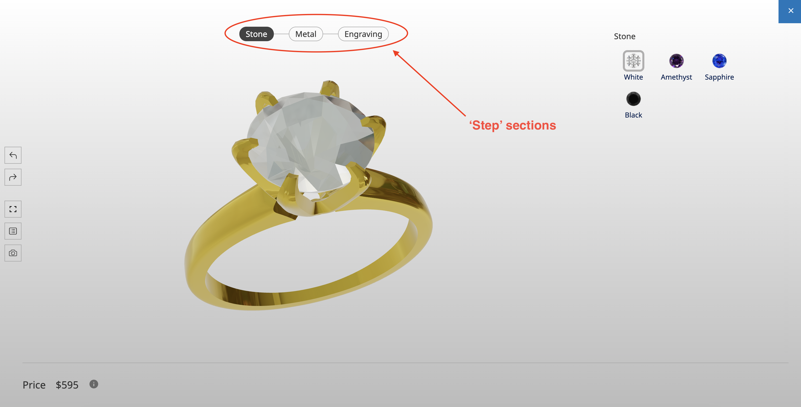 The Steps section is another way to group your options in a configurator by creating header tabs. Like side sections, steps are a great way to keep the configurator looking clean.