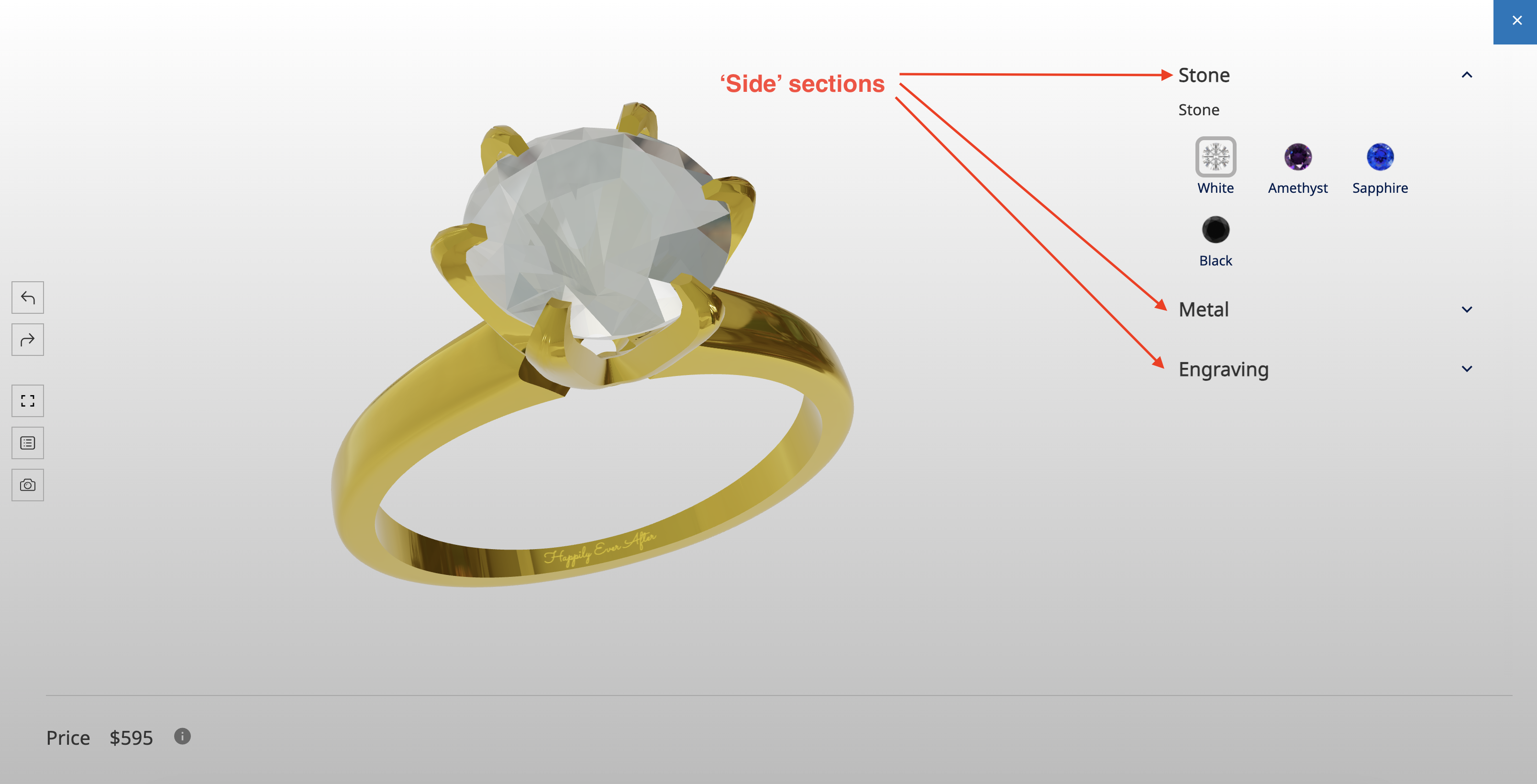The side sections allow you to group your options into a configurator. These sections are best suited for left and right vertical menus, but can be used for horizontal menus in a layout configurator.