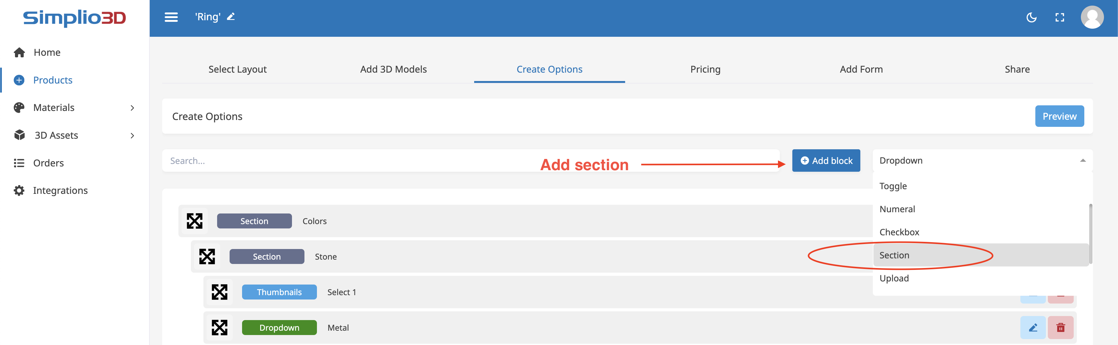 Sections can be added in the same way we add "Default" blocks or option sets. The section block is found in the "Create Options" tab at the top right of the screen, in the drop-down button. Select "Section" and click the blue "**Add block**" button.