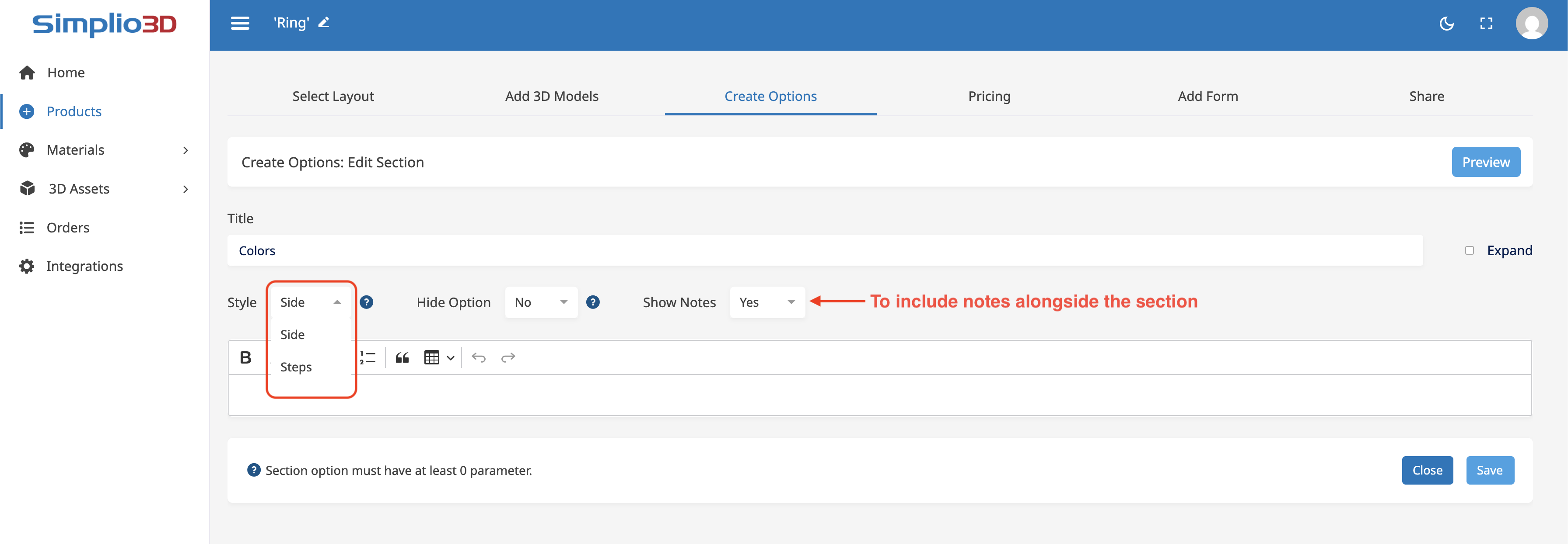 Before adding the section to the configurator layout, the platform will prompt you to provide a title and select the type of section you want to add (*Side or Steps*). The section title and type can be changed at any time by clicking the edit icon found in each section block.
